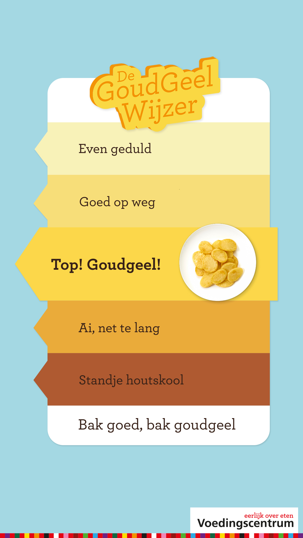 Gebakken aardappeltjes? Die eet je goudgeel krokant, niet donkerbruin of met een zwarte rand. Zo krijg je zo min mogelijk acrylamide binnen, een vermoedelijk kankerverwekkende stof. Dus bak niet te heet, keer regelmatig om en haal op tijd van het vuur.