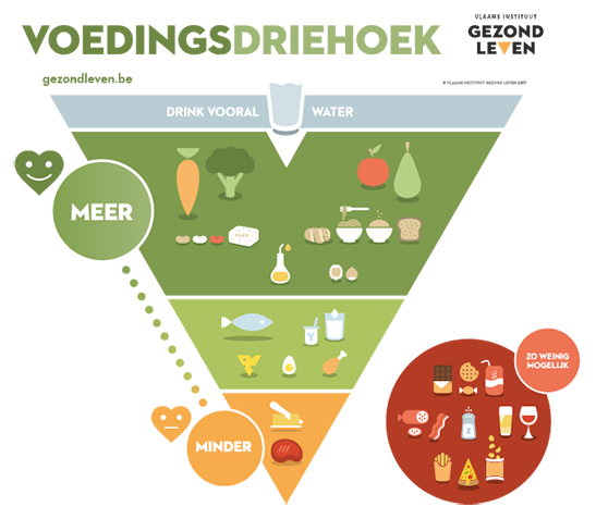 In Vlaanderen is het Vlaams Instituut Gezond Leven verantwoordelijk voor de voedingsdriehoek, het equivalent van de Nederlandse Schijf van Vijf. In de vernieuwde driehoek staan voedingsmiddelen gerangschikt volgens hun effect op onze gezondheid. Er werd ook rekening gehouden met milieuaspecten en de actuele voedingsgewoonten van de Vlaamse bevolking.