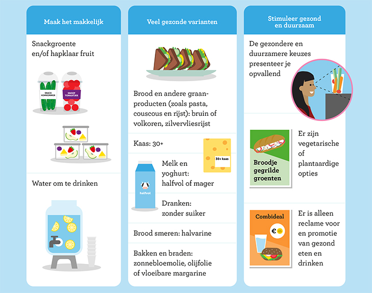Maak je eetomgeving gezonder en duurzamer en schuif op richting de Schijf van Vijf! Producten die je op een aantrekkelijke manier presenteert, in het zicht zet en makkelijk te pakken en te eten zijn, kiezen mensen sneller. Laat dat dus de gezondere en duurzamere opties zijn. Maar hoe doe je dit? Onze checklist helpt je op weg.
