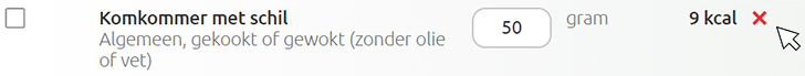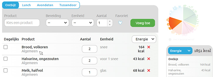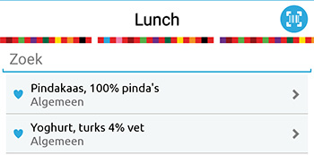 - Favorieten: Je kunt nieuwe favorieten aanmaken met het hartje in je eetdagboek die bij de producten staan. In je eetdagboek staan favorieten bovenaan als je een product zoekt.