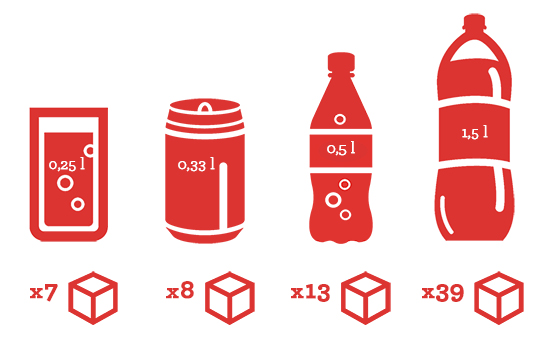 die je drinkt. Hieronder zie je hoeveel suiker een glas cola, blikje cola, flesje cola en een grote fles cola bevat.