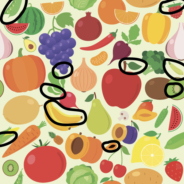 De appel die je overhoudt, is deze, helemaal onderin de fruitschaal.