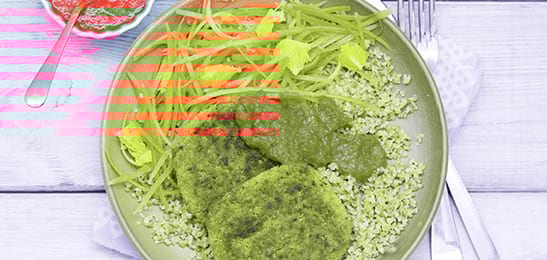 Bak de kikkererwtenburgers in de hete margarine in 8 minuten heet en bruin.