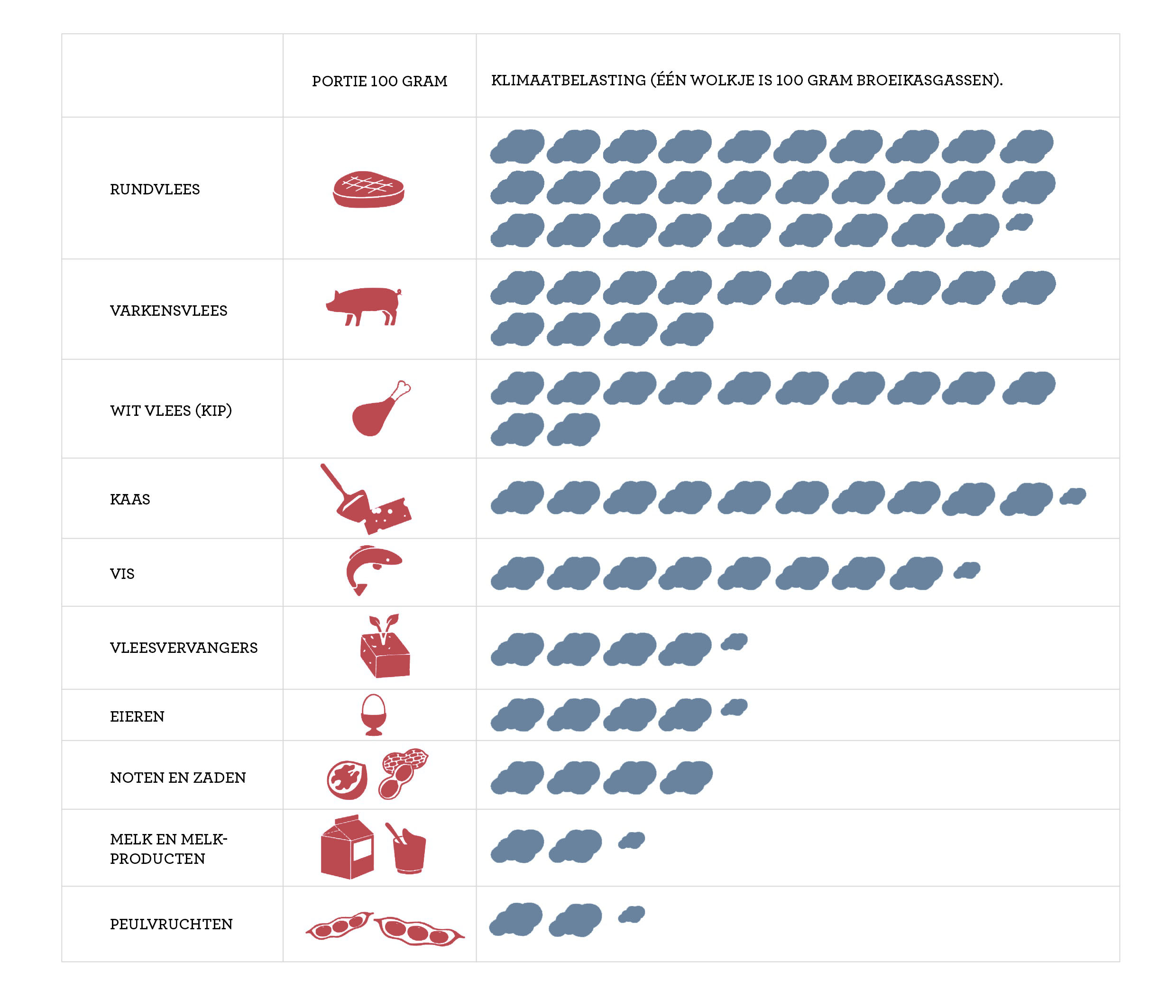 De productie van eten vraagt veel van de wereld. Voedsel is verantwoordelijk voor 20 tot 35% van de uitstoot van alle broeikasgassen. Meer dan de helft daarvan komt van vlees en zuivel. Eten produceren kost ook veel water en er gaat bos en natuur verloren. Bovendien is er vervuiling door mest. Door minder vlees en zuivel te nemen help je het milieu. Door één dag per week minder vlees te eten, verlaag je de milieu-impact van je voedingspatroon met wel 5 tot 10%.