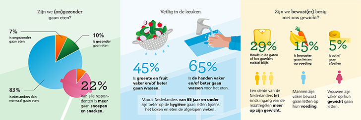 Toch blijft niet alles bij het oude. 1 op de 10 Nederlanders geeft aan gezonder te zijn gaan eten nadat de coronamaatregelen van kracht werden. Redenen zijn onder andere: meer tijd om gezond te koken, bewust met gezonde voeding bezig zijn en de behoefte om de weerstand te vergroten. Ook geeft een deel aan minder ongezonde verleidingen te ervaren door anderen (bijvoorbeeld geen koekje bij de koffie) of doordat ze niet meer uit eten gaan.
