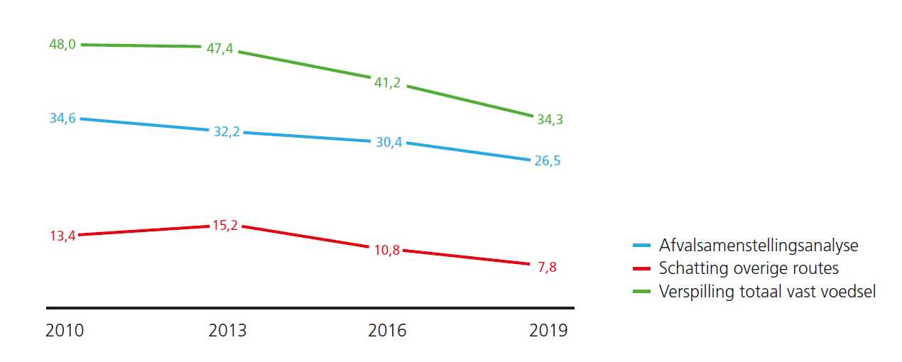 Daling van voedselverspilling van huishoudens 2010-2019 (in kg per persoon per jaar).