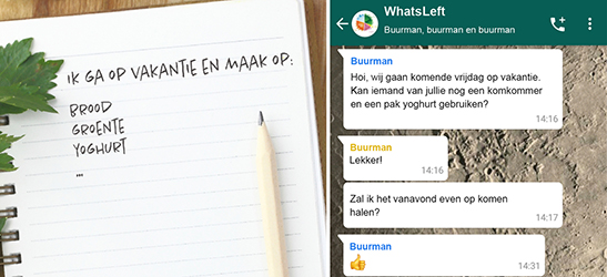 Het kan gebeuren dat er nog eten of drinken overblijft voor vertrek. Bedenk dan op tijd wie je er blij mee kunt maken; familie, vrienden of – lekker dichtbij - je buren. “Laat de buren in je koelkast gluren. Dat is de makkelijkste oplossing om overgebleven eten van de afvalbak te redden. Een pak zuivel, een paar eieren, een courgette of een netje sinaasappels kan iedereen nog wel gebruiken.” Gluren hoeft overigens niet letterlijk genomen te worden. “Je kunt natuurlijk ook even aanbellen of appen welke producten je in de aanbieding hebt. Een foto van de inhoud van je koelkast sturen is ook handig.”