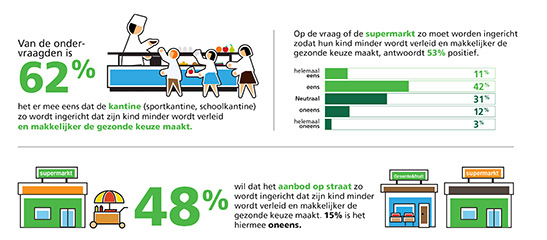 • 62% van de ouders vindt dat sport- en schoolkantines zo moeten worden ingericht dat het kind makkelijker een gezonde keuze maakt.