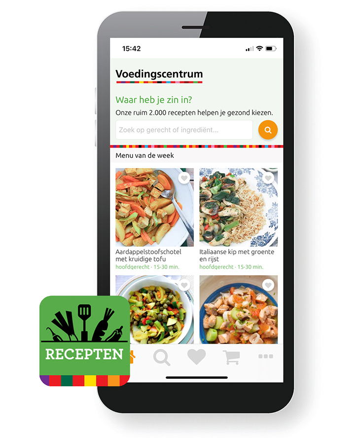 In de receptenapp Slim Koken vind je bijna 2.000 recepten van het Voedingscentrum. Wij stellen onze recepten met zorg samen. Zo hoef jij je niet druk te maken of je wel gezond bezig bent. In onze recepten werken we vooral met producten uit de Schijf van Vijf.