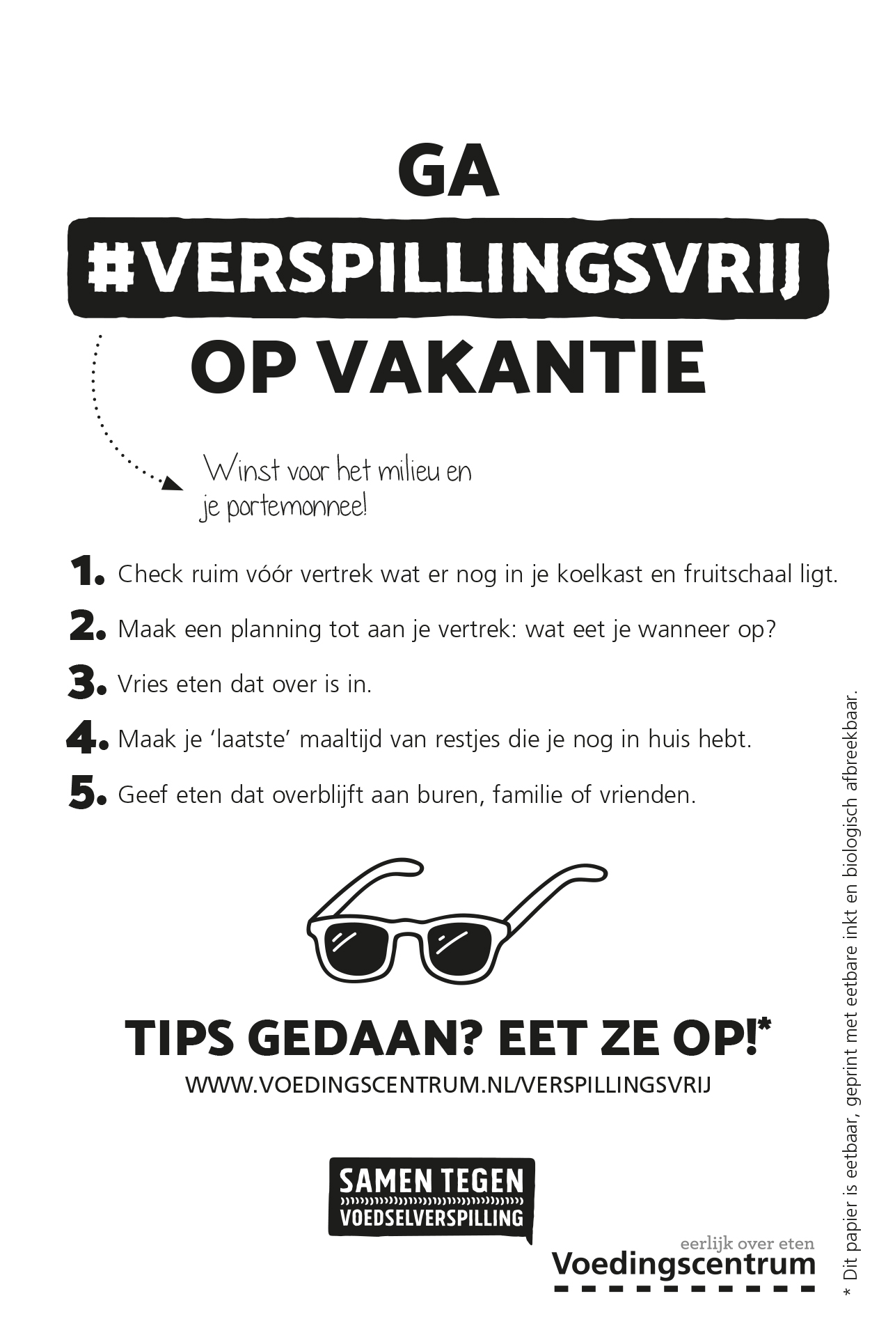 Op maandag 15 juli vraagt het Voedingscentrum aandacht voor een verspillingsvrij vertrek op vakantie. Op station Den Haag Centraal worden 2.000 checklijstjes van eetpapier* uitgedeeld. Op het eetpapier staan 5 tips. Heb je een tip opgevolgd? Eet hem van je lijstje af. Tot er geen tip (en kruimel) meer over is.