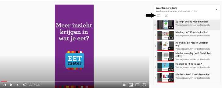 Herhaal deze playlist door te klikken op het teken waarbij 1 pijltje naar rechts wijst en de andere naar links. In de afbeelding hieronder wijzen we het aan met de zwarte pijl.