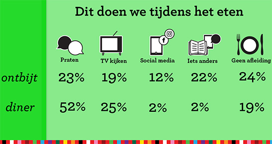 partner/gezinsleden tijdens het avondeten. 25% kijkt tv, 4% checkt sociale