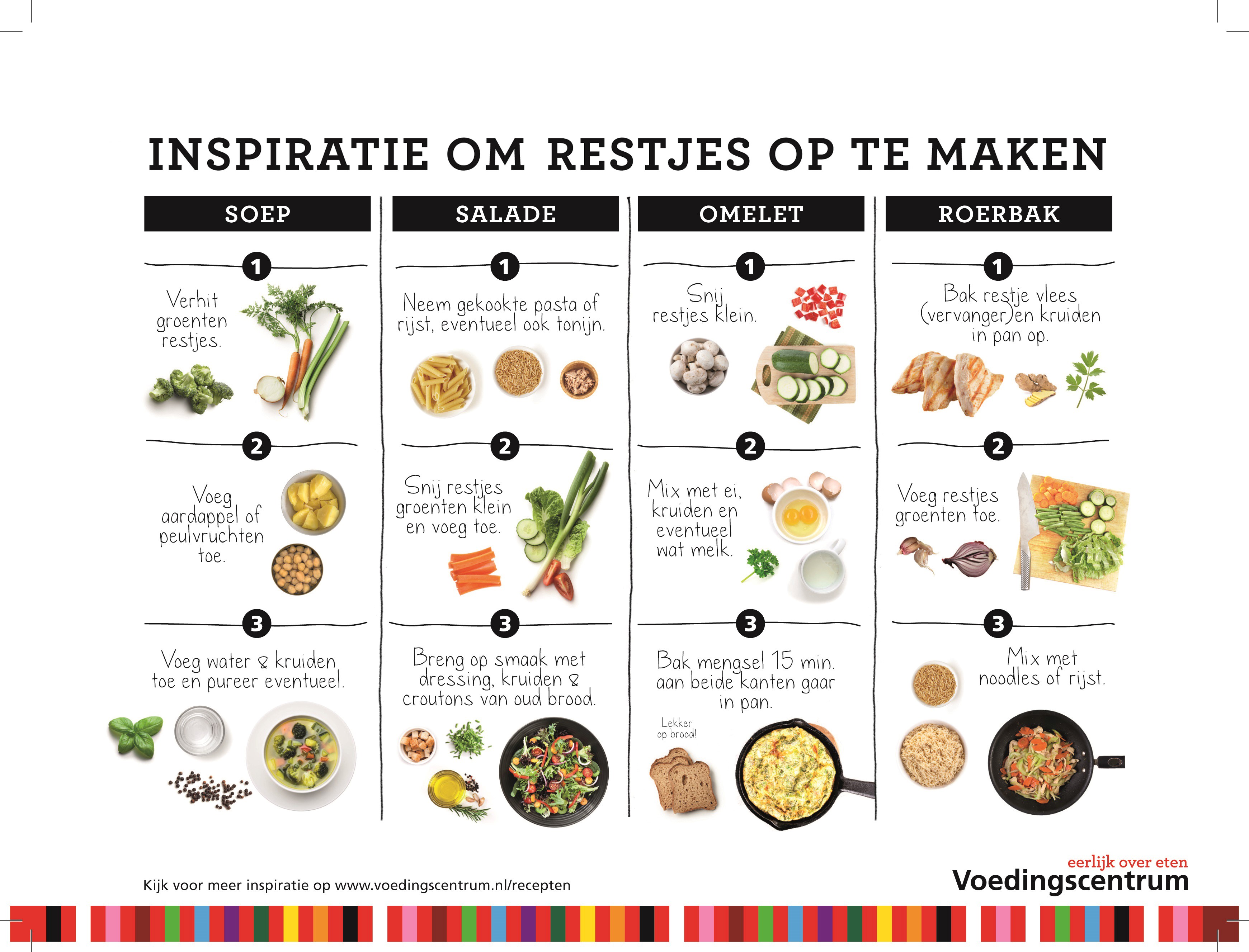 Eten weggooien is super zonde. Al dat voedsel is dan voor niks gemaakt. Dat is zeker niet duurzaam. Met restjes en kliekjes kun je nog een heleboel doen. Heb jij goede ideeën? Klik op de foto voor een vergroting.