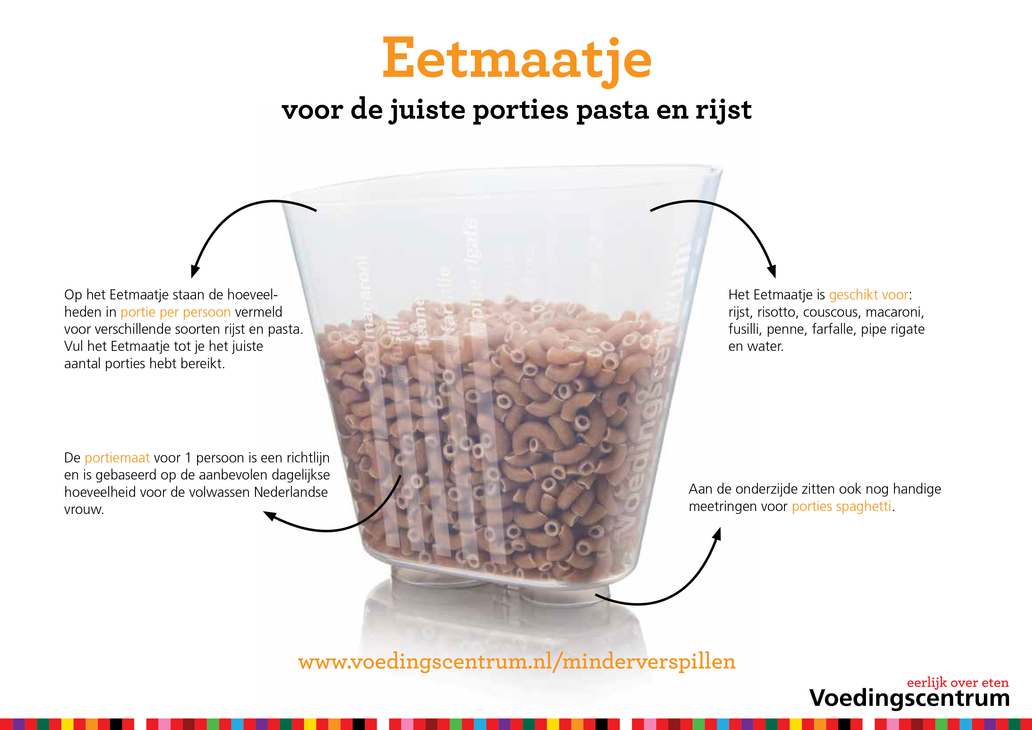 Het Eetmaatje gaat niet uit van alleen deciliters of grammen, maar van porties voor ‘1 tot 4 personen’. Daarmee draagt deze portiemaatbeker bij aan het voorkomen dat je teveel pasta of rijst kookt en dus daarvan verspilt. Voor het Eetmaatje geldt: de streepjes die de porties aangeven zijn bedoeld als richtlijn.