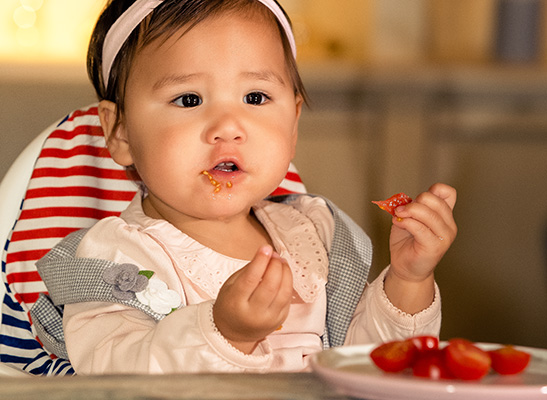 - Zorg dat de stukjes eten voor je dreumes of peuter niet te groot zijn. Cherry-tomaatjes en druiven kun je halveren of in stukjes snijden.