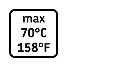 Dit symbool laat zien tot welke temperatuur het servies kan. In dit voorbeeld staat er 70 °C; dat betekent dat het servies hittebestendig is tot deze temperatuur. Soms wordt de temperatuur ook in Fahrenheit aangegeven.